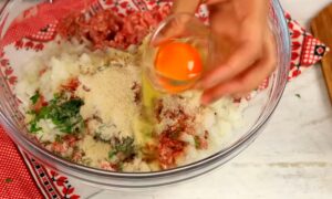 1. U velikoj posudi pomešajte mleveno meso sa sitno seckanim lukom, jajetom i prezlama. Dodajte začine po ukusu kako bi ćufte dobile prepoznatljivu aromu. Smesu dobro izmesite rukom dok ne postane potpuno kompaktna i jednolika kako se ćufte ne bi raspadale tokom kuvanja.