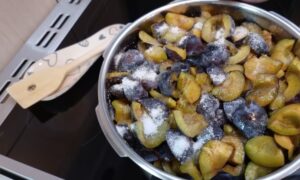 - Dodavanje šećera: Kada voće postane kašasto, dodajte šećer. Količinu prilagodite svom ukusu – ako su šljive veoma zrele i slatke, biće vam potrebno manje šećera.