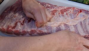 - Svinjska rebra (1,5 kg) operi i osuši papirnatim ubrusom. Sa unutrašnje strane rebara ukloni opnu (srebrnastu kožu) — podvuci nož ispod nje, uhvati papirnatim ubrusom i povuci. Bez toga marinada ne prodire u meso i opna postaje žilava tokom pečenja.