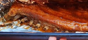 - Izvadi rebra iz rerne, pažljivo otvori foliju (pazi na vrelu paru). Premazati obilno sa 4 kašike BBQ sosa sa obe strane. Vrati u rernu bez folije i peči još 15–20 minuta na 200°C dok sos ne karamelizuje i rebra ne dobiju lepu tamnu koricu.