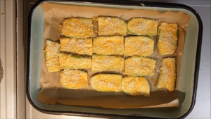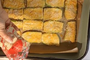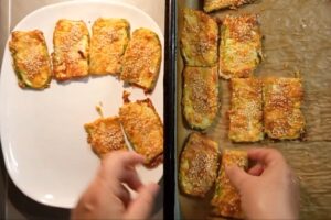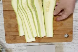 - Tikvice dobro operite, oljuštite (ako su starije). Posolite ih i ostavite da odstoje oko pola sata kako bi so izvukla suvišnu vodu. Uključite rernu da se greje na 200°C i blago podmažite pleh za pečenje sa malo ulja. Nakon pola sata, rukama ili čistom pamučnom krpom dobro iscedite svu tečnost iz tikvica. Ovo je ključan korak kako jelo ne bi bilo gnjecavo.